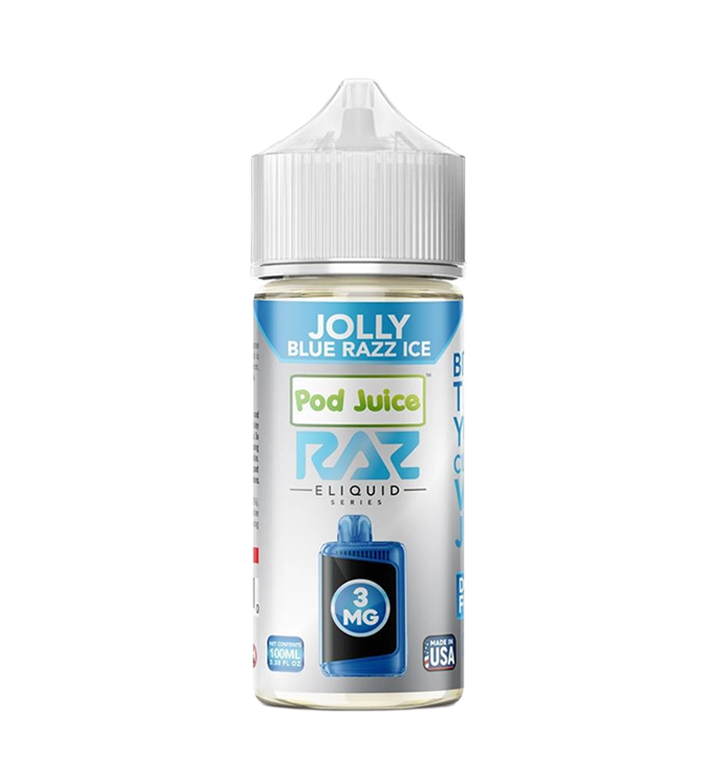 Pod Juice x RAZ - Jolly Blue Razz Ice 100mL combines sweet-tart blue raspberry with an invigorating menthol kick for the ultimate icy fruit experience. This premium 100mL freebase e-liquid delivers the nostalgic flavor of blue raspberry candies enhanced by a crisp, cooling finish. The generous bottle size provides extended vaping pleasure with bold flavor and dense vapor production, optimized for sub-ohm devices. Enjoy the perfect balance of juicy berry sweetness and refreshing chill - a vibrant flavor that's both playful and satisfying, delivering the best of both worlds for fruit and menthol lovers.