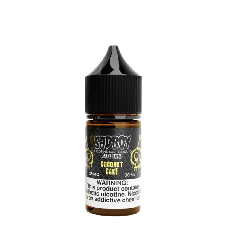SadBoy Nicotine Salt E-Liquid - Coconut Cake 30mL combines sweet coconut and rich cake flavors. This salt nicotine e-liquid delivers a smooth and indulgent tropical dessert-inspired vaping experience in a convenient 30mL bottle.